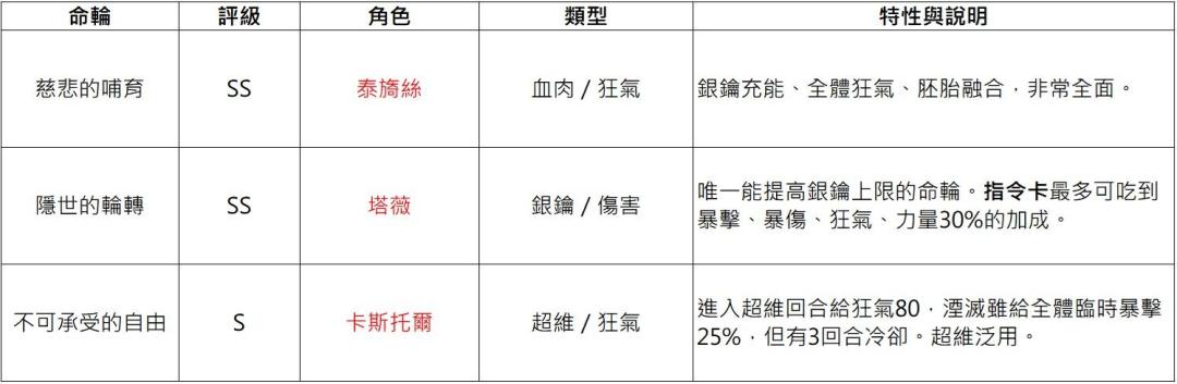 这篇主要是#忘却前夜 新手向,简单介绍各个SSR命轮的特性、评价,以及是否值得长期投资等(比如后期融灾较常用到哪些命轮)。希望能帮助刚接触的玩家,厘清选择与投资方向,避免浪费「轮转之书」等资源。 补充说明: 1. 配戴SSR+12的命轮后,可以再戴一个SSR命轮。 2. 下面提到的命轮都是以3叠之后的数值去评价。 3. 角色红字为限定唤醒体,与常驻角色做区别。 4. 分类方式以其特殊性 > 主效果