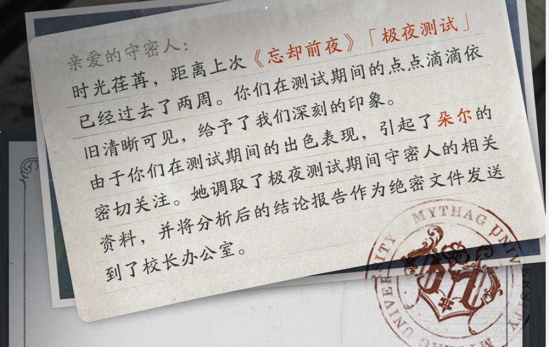 时光荏苒,距离上次《忘却前夜》「极夜测试」已经过去了两周。你们在测试期间的点点滴滴依旧清晰可见,给予了我们深刻的印象。 由于你们在测试期间的出色表现,引起了朵尔的密切关注。她调取了极夜测试期间守密人的相关资料,并将分析后的结论报告作为绝密文件发送到了校长办公室。#忘却前夜
