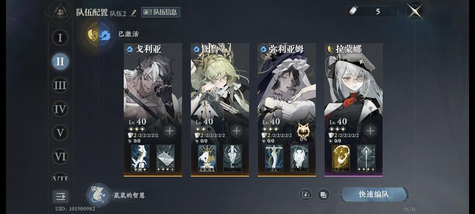 这是我现在能凑出来完整的队伍,剩下的一个是第一波水船,反击拼好队,另一个是借地瓜或者血希。现在羊妈和希洛被茉夏拿走了,又没有超限皮,感觉血肉也不好出了。密契只有入药,埋骨地和四月洗了洗。请问这几套属性对吗?还需要做什么套?不是很清楚这些角色都吃什么属性。还想问一下,我有时候会出融朵罗坦,但感觉落地回不起来狂,是需要死扛启动吗?