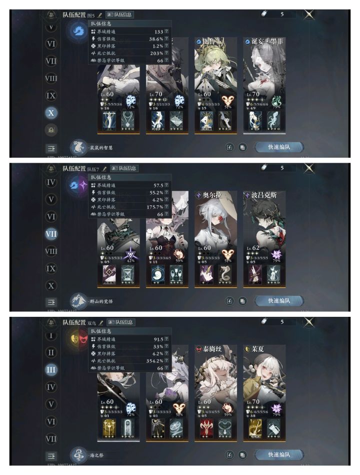 这是我现在能凑出来完整的队伍,剩下的一个是第一波水船,反击拼好队,另一个是借地瓜或者血希。现在羊妈和希洛被茉夏拿走了,又没有超限皮,感觉血肉也不好出了。密契只有入药,埋骨地和四月洗了洗。请问这几套属性对吗?还需要做什么套?不是很清楚这些角色都吃什么属性。还想问一下,我有时候会出融朵罗坦,但感觉落地回不起来狂,是需要死扛启动吗?
