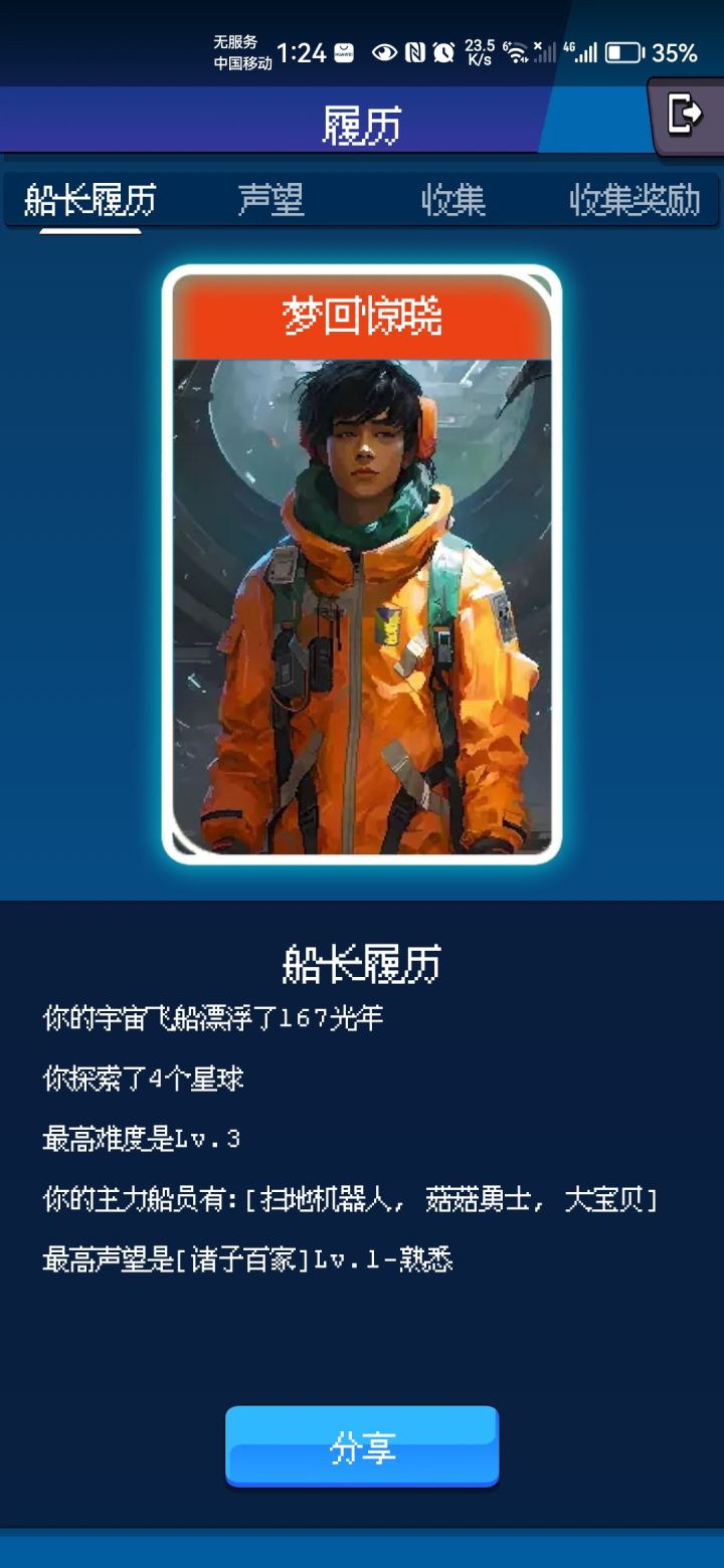 你的宇宙飞船漂浮了200光年 你探索了7个星球 最高难度是Lv.6 你的主力船员有:[渡鸦之王福金, 力场穿梭机, 扫地机器人] 最高声望是[乌拉诺斯行星理事会]Lv.5-成员