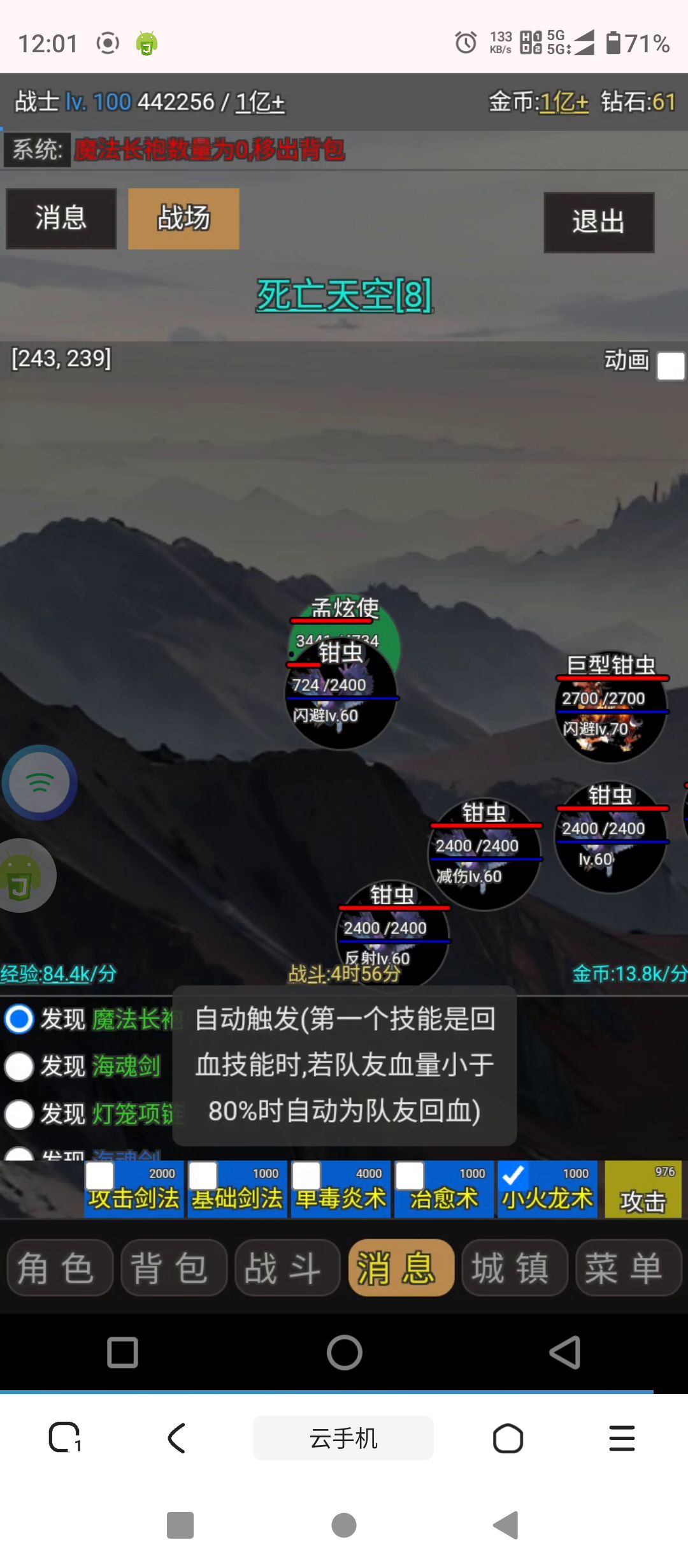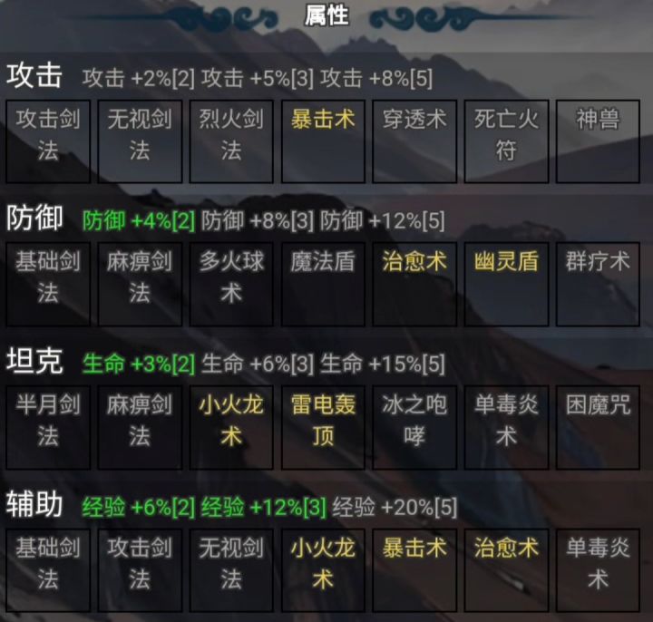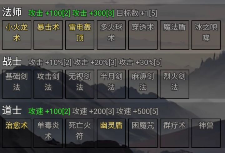 三大职业:法,道,战,除了真正喜欢战士的,前 期不建议选战士开局,因为发育实在是太慢了,可 以玩到后期技能熟练度满了之后切换玩玩,毕竟看 被动成型了之后在pvp会有一席之地。 个人前期首推法师,因为被动会让你多打一个怪 凑齐5技能羁绊还能再多打一个,加上比较前期容易 获得的2目标技能就是四个怪,比如雷电,小火,暴 击这些。装备属性的话首推速度(堆起来才能放出 更多技能,一般能放到第二个就差不多了