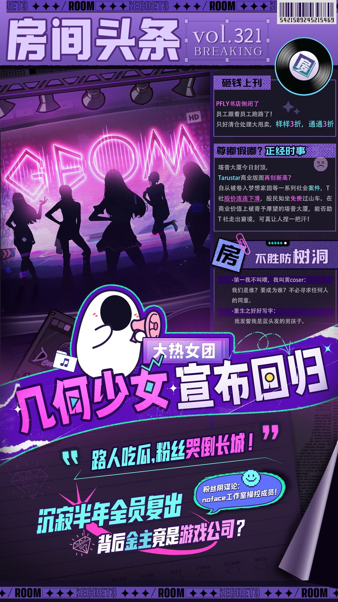 【回归第一波爆料开奖结果】 73L: 这里是<花生独家瓜报> !!房3最新消息有!! 《房间的秘密3:女团回归夜》即将上线,花生在工作室潜伏多日终于拿到一手新鲜内幕! 几何女团回归背后竟有不为人知的超级大瓜? ——————————参与有奖—————————— 第一波爆料花生藏了福利给大家,评论区说出你认为的海报暗藏彩蛋! 游戏上线当日将随机抽一位大开脑洞的房友,送出<房3惊喜随机周边>1个! 注意