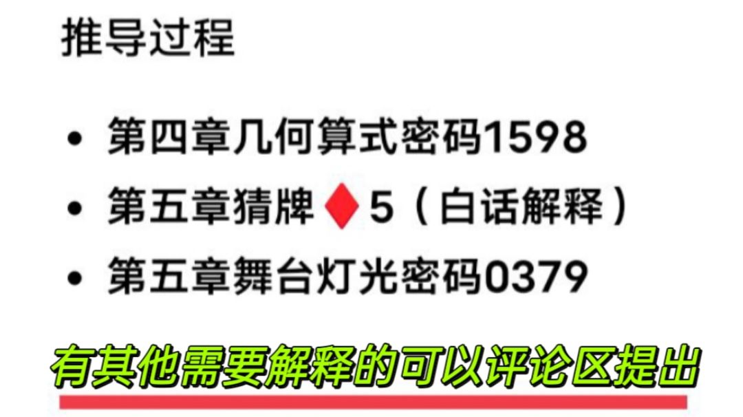 可以直接看图片,文字我会省流直接放每个地方谜题需要的密码 1.播放录音需要打开录音室的电脑,电脑密码为:157 2.调音台每个按钮的在的格子数(从上到下)从左往右为:142315 3.手机网络设置连接wifi密码为:33361 4.筱圆房间床左边墙上的心形摆台,星座点击顺序为:132465 5.筱圆房间床上的娃娃背后密码为:IOZ 6.录音室电脑下面的抽屉密码为:TRAR 7.打开高跟鞋柜子的密码