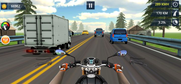 驱动快速,安全。避免警车,大卡车和路障。在这个疯狂的摩托车赛车18游戏中,提高你的速度并打败大家。