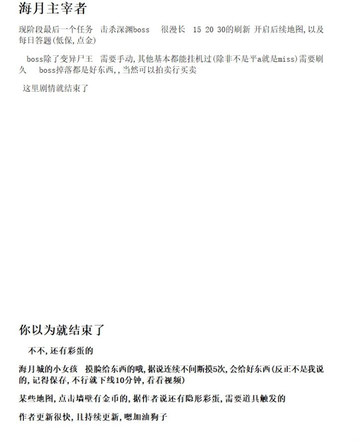 前期按照李白大佬的道士四小时攻略发育。(论坛直接搜)战士由于前期贫弱,有些需要注意的点 1、所有小BOSS建议至少杀8只,这样怪物猎人图鉴对应等级至少2级。积少成多也是不少属性。 2、软泥王出紫水晶戒指,战士务必刷一个,加物伤加成 3、强化药水一定要留好,战士过腐王全靠它 4、过了半兽人勇士任务后去海月城找老头对话,开启海月城杂货店(老头在上方一堆NPC的位子,杂货店在城市左下方),买好