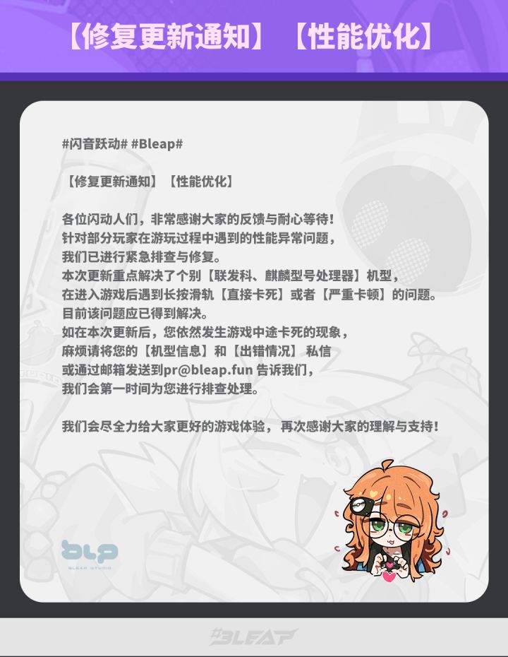 #闪音跃动 # #Bleap # 各位闪动人们,非常感谢大家的反馈与耐心等待! 针对部分玩家在游玩过程中遇到的性能异常问题,我们已进行紧急排查与修复。本次更新重点解决了个别联发科、麒麟型号处理器机型, 在进入游戏后遇到 长按滑轨直接卡死或者严重卡顿的问题。目前该问题应已得到解决。 如在本次更新后,您依然发生游戏中途卡死的现象, 麻烦请将您的【机型信息】和【出错情况】 私信或通过邮