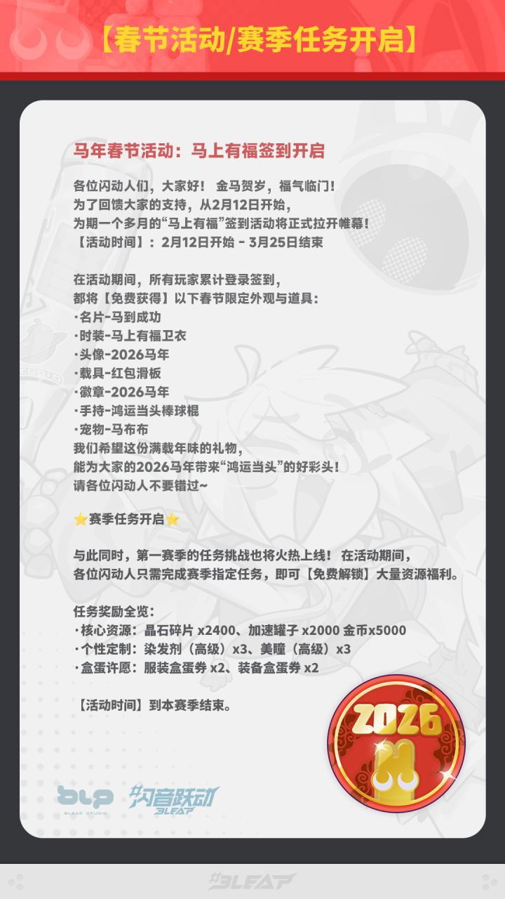 #闪音跃动 #Bleap 【马年春节活动】【马上有福签到开启】各位闪动人们,大家好! 金马贺岁,福气临门!为了回馈大家的支持,从2月12日开始,为期一个多月的“马上有福”签到活动将正式拉开帷幕!【活动时间】:2月12日 开始 - 3月25日 结束在活动期间,所有玩家累计登录签到,都将【免费获得】以下春节限定外观与道具:✦名片-马到成功 ✦时装-马上有福卫衣 ✦头像-2026马年