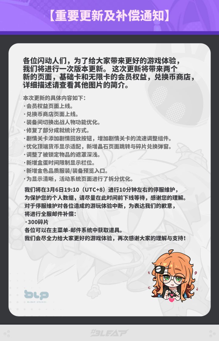#闪音跃动 #Bleap各位闪动人们,为了给大家带来更好的游戏体验,我们将进行一次版本更新。 这次更新将带来两个新的页面,基础卡和无限卡的会员权益,兑换币商店,详细描述请查看下图的简介~本次更新的具体内容如下: ✦会员权益页面上线。 ✦兑换币商店页面上线。 ✦装备间切换出战人物功能优化。 ✦修复了部分成就统计方式。✦剧情关卡添加剧情回放按钮,增加剧情关卡的流速调整组件。 ✦优化