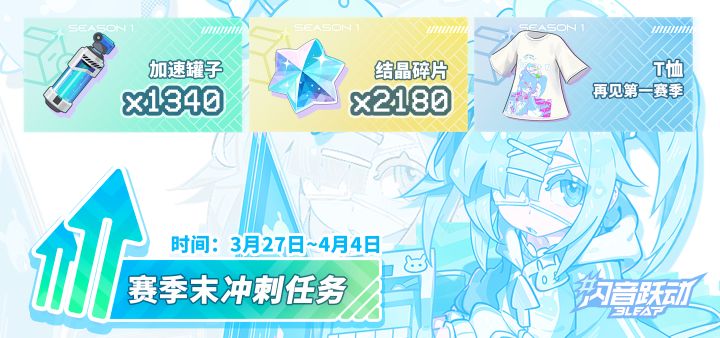 #闪音跃动 #Bleap 各位闪动人们,大家好!第一赛季还剩最后一周就要结束啦。为了助力大家在最后阶段拉满进度,赛季末冲刺任务现已正式上线!我们将第一赛季的全部14首歌曲作为本次的任务目标,快来挑战谱面,把丰厚奖励全部带回家吧!✦活动截止日期:4月4日✦任务总奖励:1340冲刺罐子,2180碎片,限定外观“T恤-再见第一赛季”请大家抓紧最后的时间,一起向着第一赛季的终点冲刺吧!