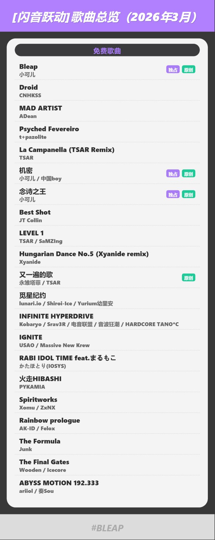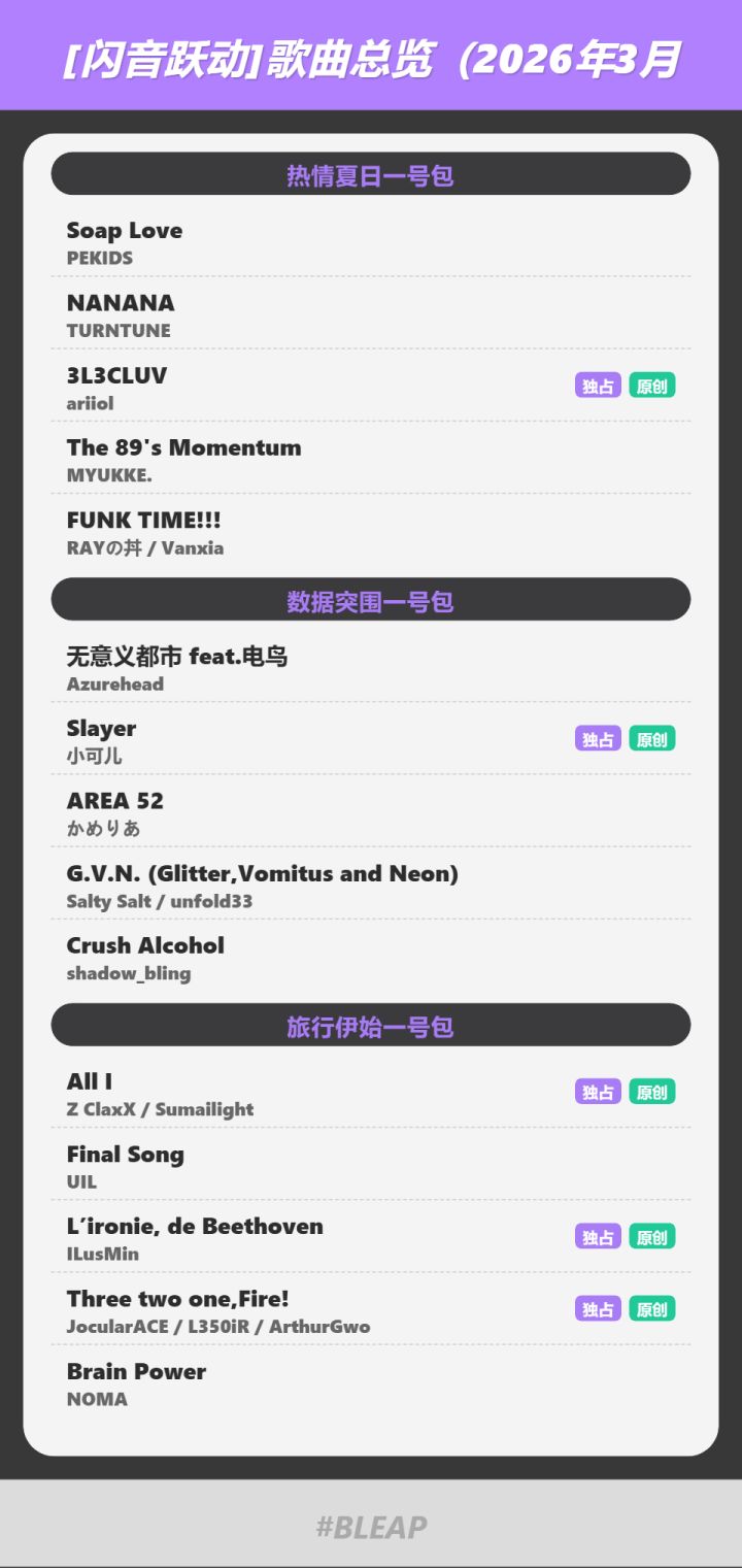 #闪音跃动 #Bleap各位闪动人们,大家好!截至2026年3月,我们在《Bleap 闪音跃动》中收录的歌曲总数已经正式突破100首大关!我们为大家整理了截至目前的收录总览。未来我们也会继续发力,为大家搜罗并更新更多优质的好音乐,带来更具挑战性的全新曲包。请大家多多期待后续的更新计划!接下来也请在《Bleap》的世界里继续享受音乐吧!