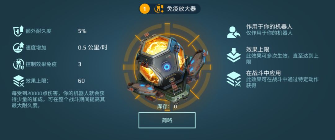 本期小坦要为大家介绍的是,能够提供强大生存能力的免疫放大器,提供稳定输出与站场能力的“均衡单元”,以及部分强力的紫色、蓝色模块解析。 【免疫放大器】 “免疫放大器”能提供额外的耐久度、速度加成及控制效果免疫。其作为三大件之一,适用范围广,绝大部分的主战机甲均可装配。 *三大件:免疫放大器,核放大器,修复放大器 除了不能直接增加输出的伤害,在强化生存能力和提升机甲机动性上,“免疫放大器”可谓是数一数