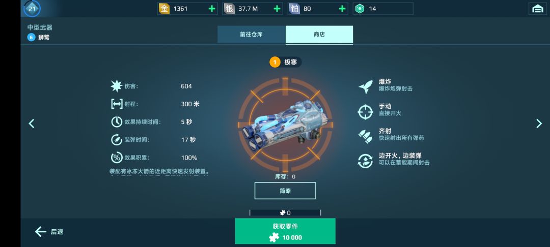 国服不值得氪金,国服不值得氪金,国服不值得氪金,重要的事情说三遍,你氪一两千还不如在国际服氪几十块拿一套mk2新机,如果非得要氪金,建议玩国际服,找我教你怎么下载 其次,非要氪金的话推荐22元买三个冰炸(游戏里叫极寒) 其他武器推荐如图,四张武器图都是重槽武器,中槽轻槽因为长的类似容易辨别所以省略(工坊非要制作啥的话就做火枪(图内唯一紫色武器),只有火枪值得做,虽然也是浪费时间) 机甲推荐大蛇、摩