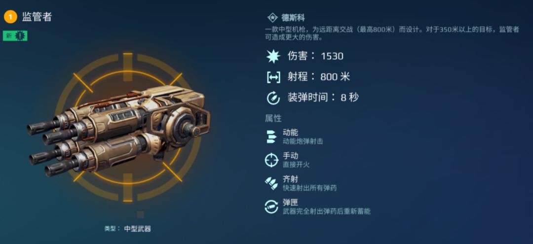 “热射枪” - [监管者]是现版本十分热门的中程武器之一。不过哪些机甲与其搭配才能够充分发挥[监管者]的优势与特点呢? 【武器简析】机枪输出之王 [监管者] 作为一款中程武器,其极快的射速与强大的DPS,完美契合机枪类武器的核心优势。而它在同类武器中更是佼佼者:不仅拥有全武器里顶尖的综合射速,同时还具备该类型武器中最强的输出伤害,两者结合让它成为中程武器火力的 “压制标杆”。 (数据信请以游戏