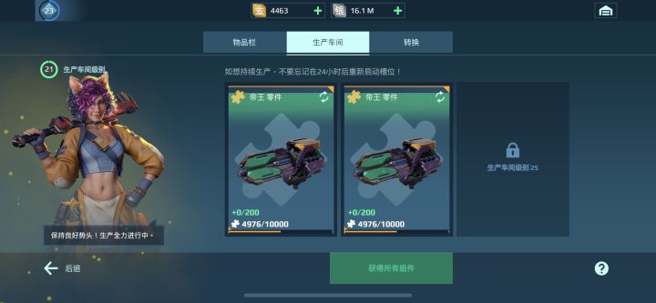 不知道大家升到25级车间用了多久?我目前玩了9天左右,从21级开启生产车间后到操作加速生产车间升级大概6天左右,今天已经到25级开启三个槽位了。具体方法很简单:(可能会有点肝)关键在于每生产一单位零件时就点击获取可以获得一定量的经验值,以我的经验在没有生产满格之前,生产一单位零件领取时获得的经验和过了一晚上生产几十个零件时领取的经验是一样的,所以每生产一单位零件时就立即领取,能够快速升级。机