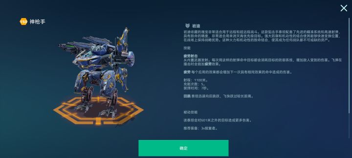 神枪手,又被称为弓兵,是目前首位、也是版本唯一主要应用于超远程打击的泰坦单位。其耐久面板为85W,自带200防御点数,搭载了三个阿尔法武器槽,火力上限高,内置武器可完成1100M内的超距打击,是典型的远程伤害者,却具备不逊色坦克型单位的生存能力。本期,小坦为大家带来狙击型泰坦——神枪手的深度解析。 永久收益 不败胜机“疲劳射击”是神枪手的核心技能,它能够通过内置武器击发的射弹,在命中后将对目标