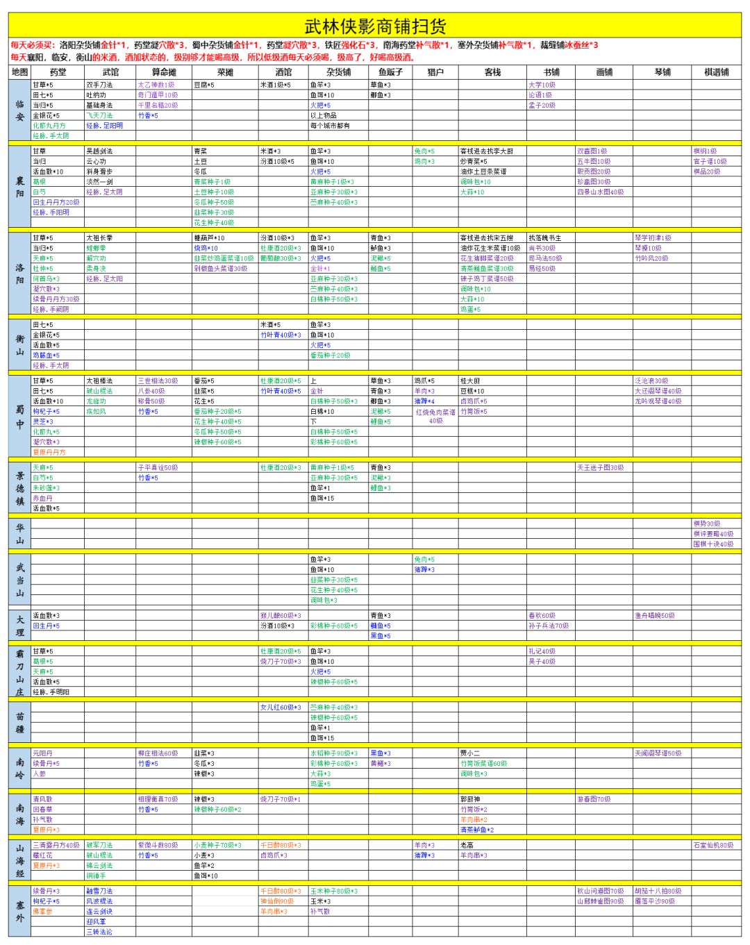 每天必须买:洛阳杂货铺金针*1,药堂凝穴散*3,蜀中杂货铺金针*1,药堂凝穴散*3,铁匠强化石*3,南海药堂补气散*1,塞外杂货铺补气散*1,裁缝铺冰蚕丝*3 每天襄阳,临安,衡山的米酒,酒加状态的,级别够才能喝高级,所以低级酒每天必须喝,级高了,好喝高级酒。