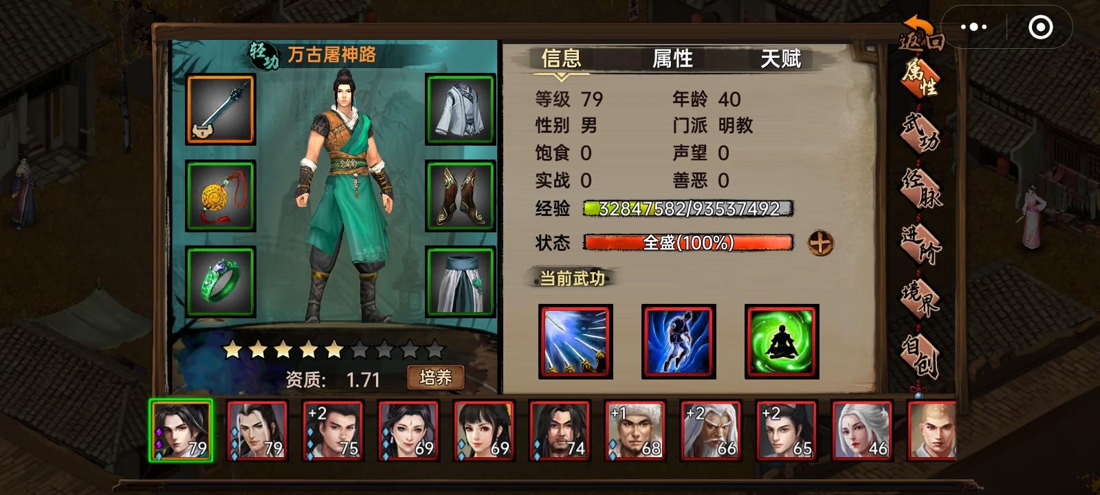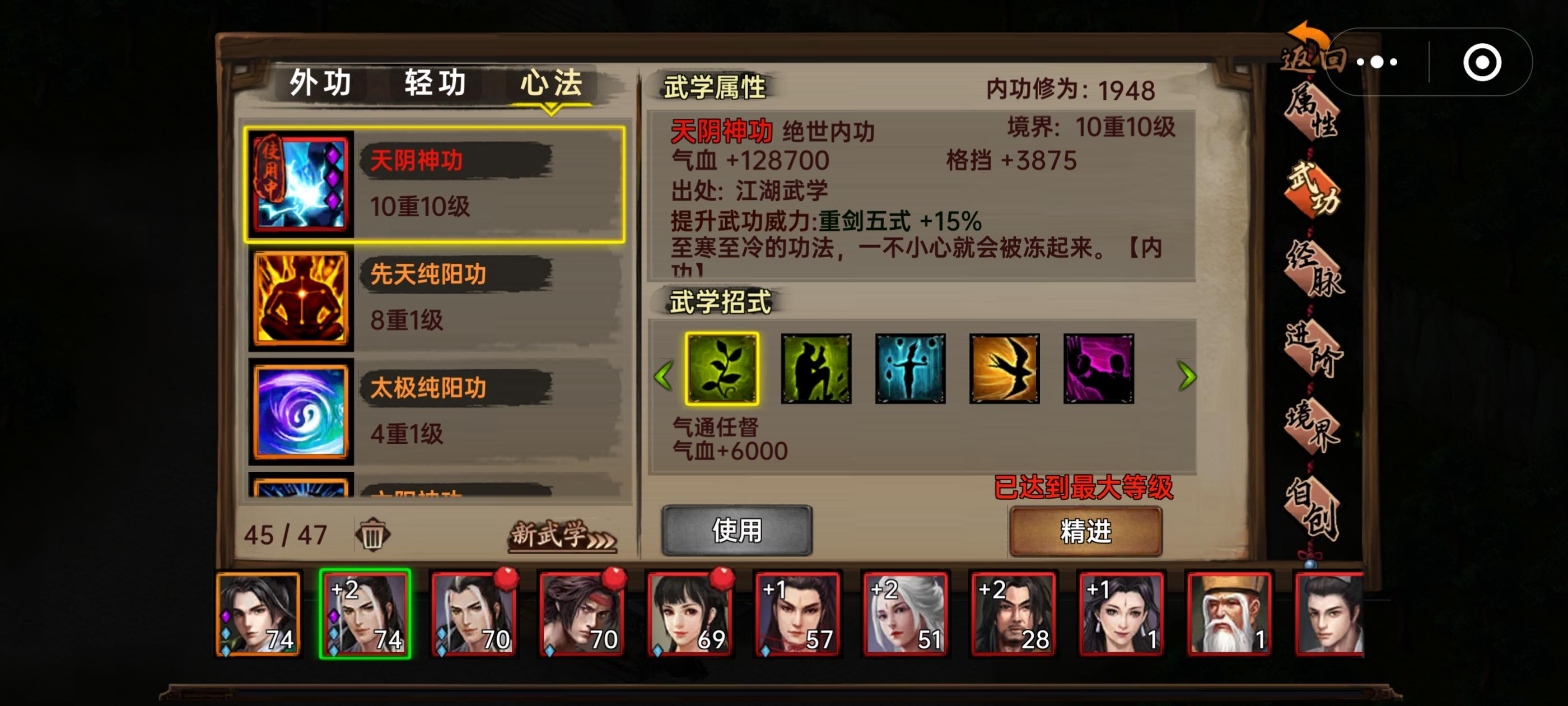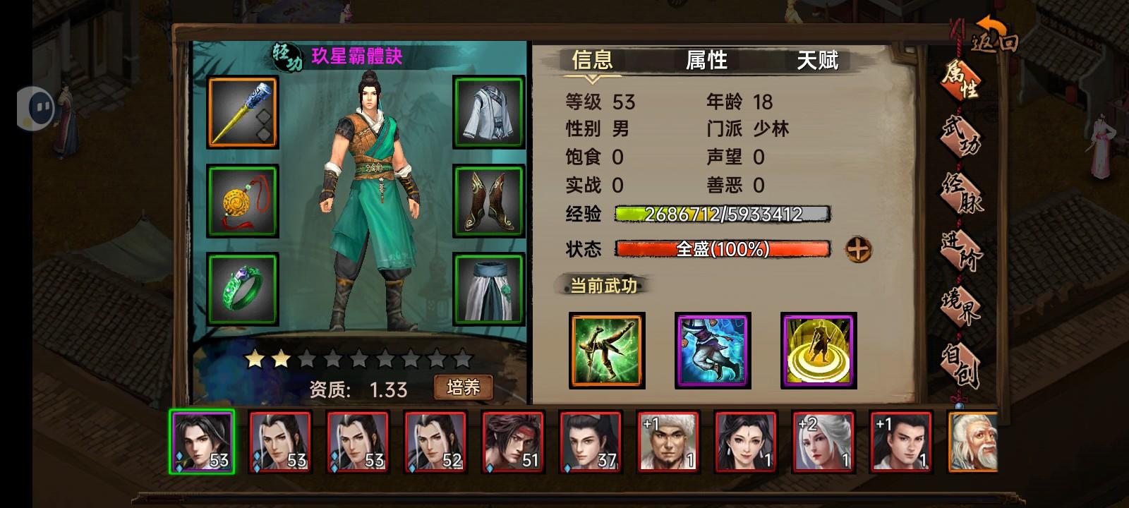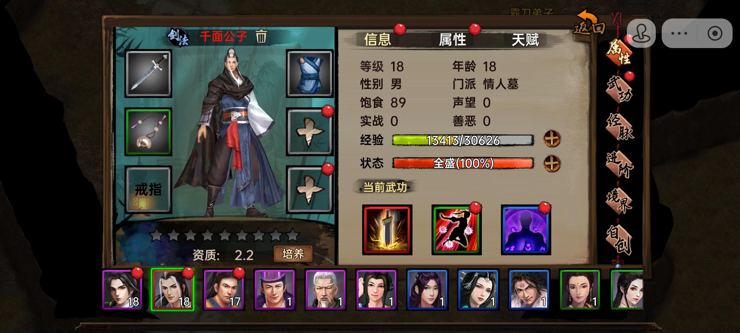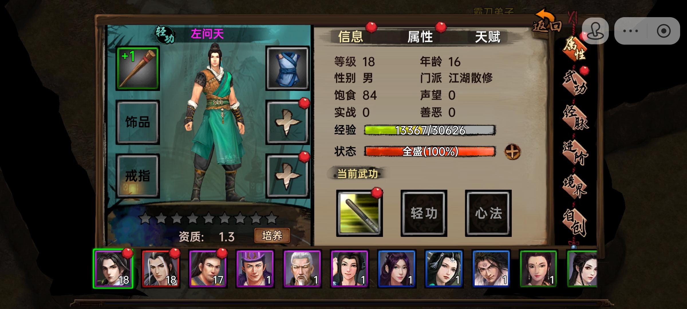 各位大侠,在下从去年底至今肝此江湖(中途归隐半年),创建约700个账号,累计微氪近千元,说几点体会(若不打算培养主角,以下内容可忽略):①性别,约等于拿出了10颗丹药的加成,男加臂力和刀法,而女加身法和剑法上。若学刀可以考虑选男,学剑则选女,也可根据自身性别来选。②天赋:不能重置是硬伤,建议选万金油,比如对男性伤害、防御,以便以后新想法换功法,避免选刀却抽出无敌剑法、选剑却抽出魔刀斩的尴尬,若