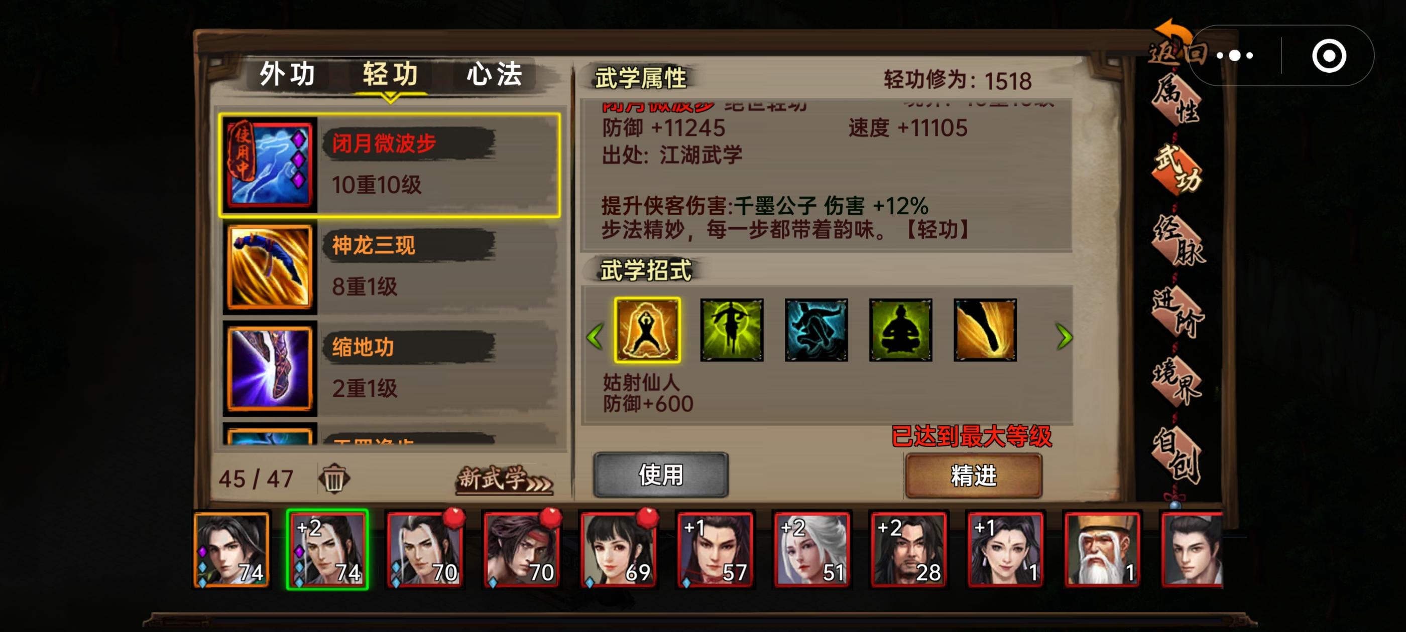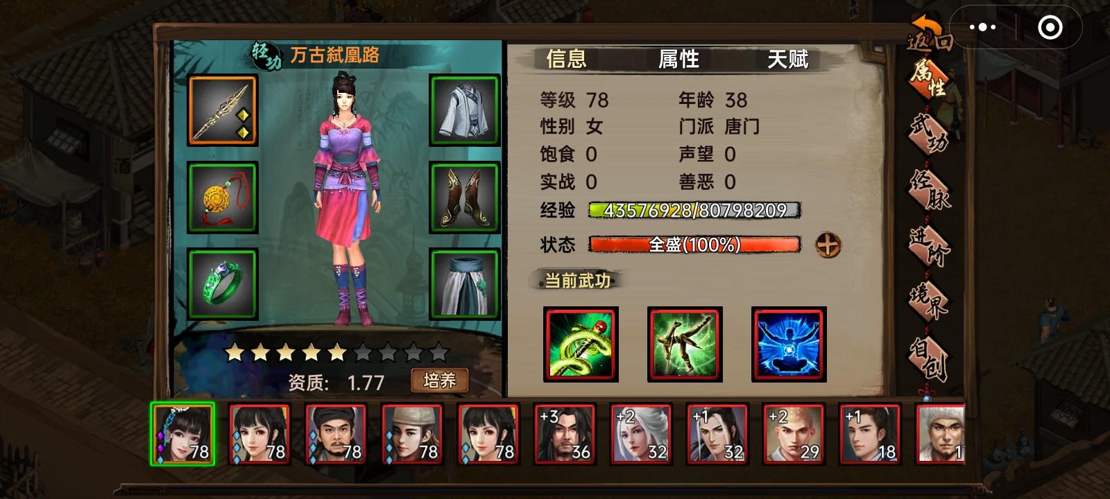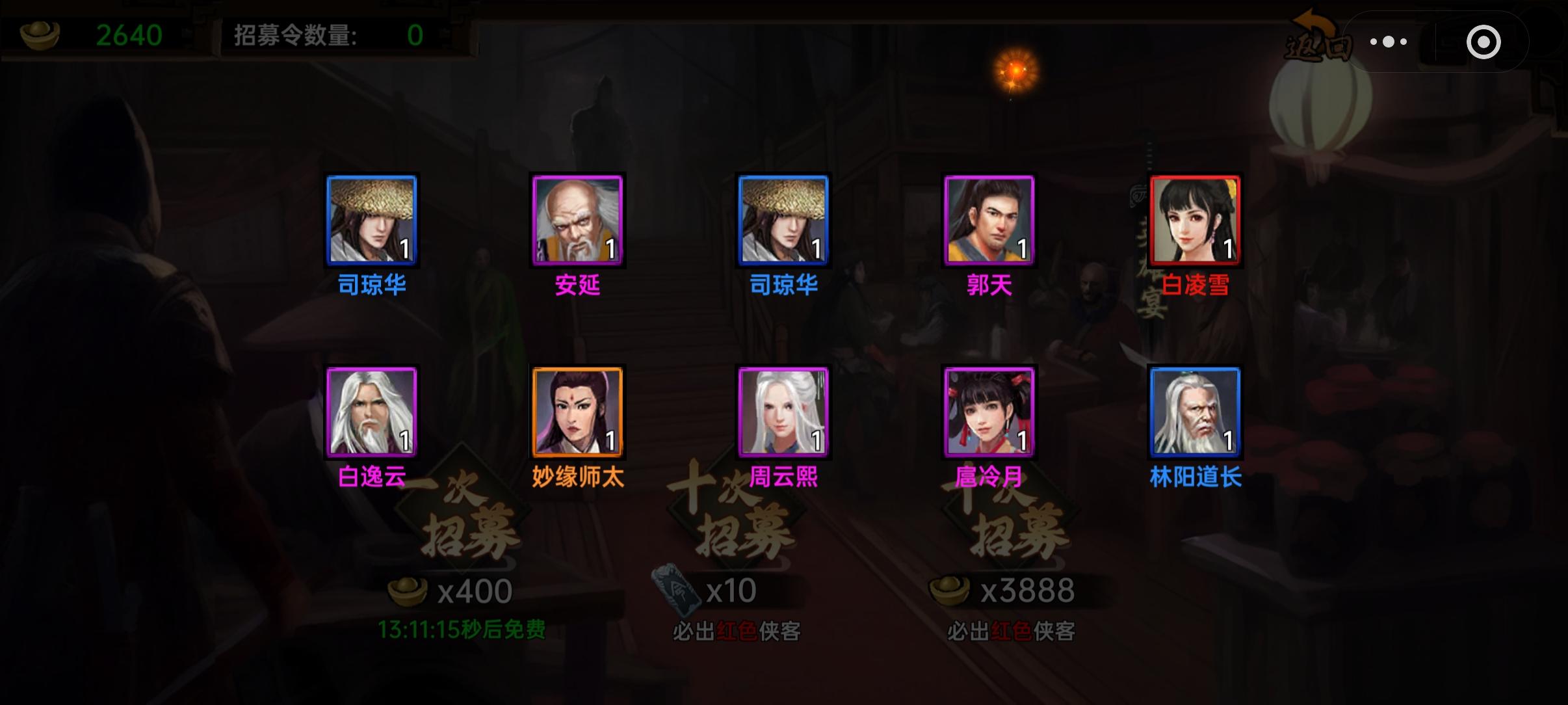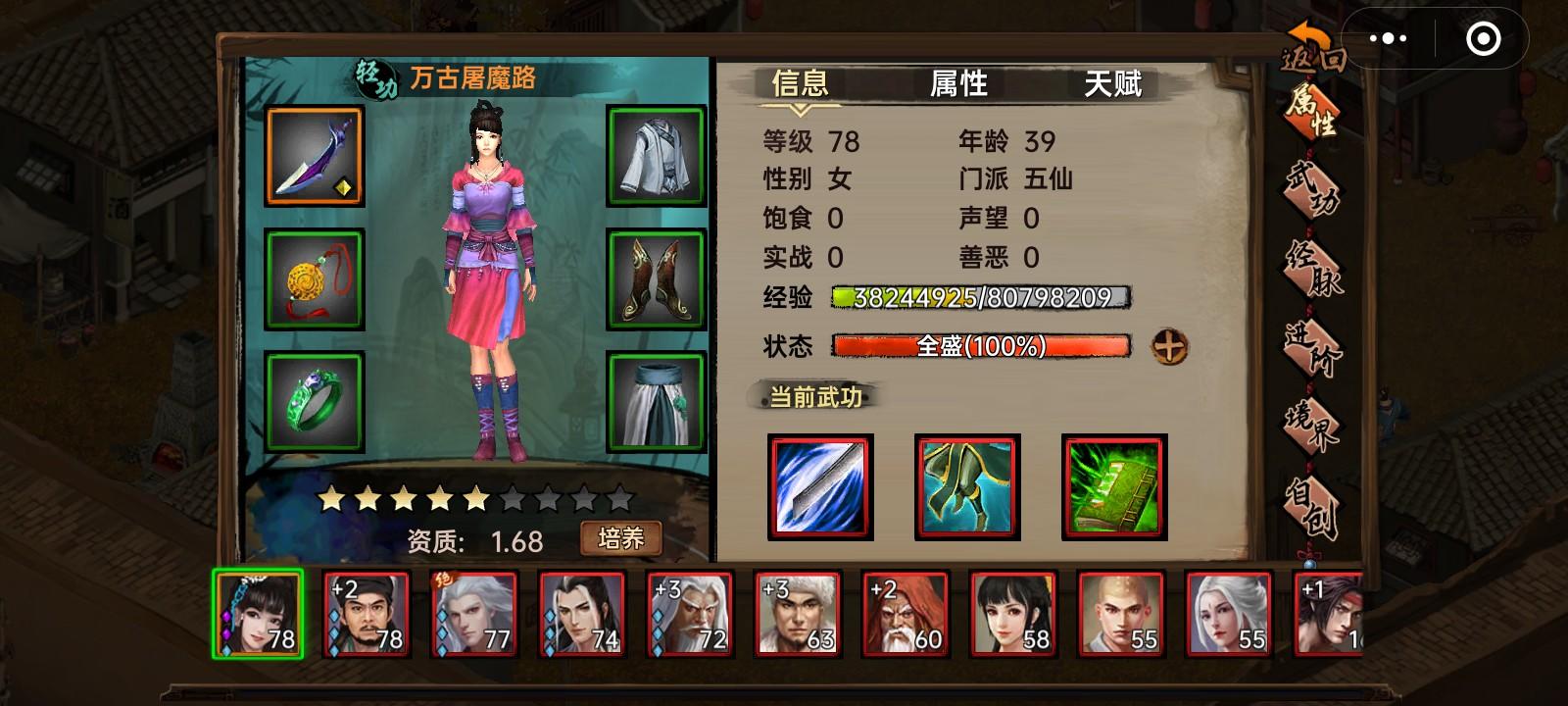 要求:上阵侠客红群攻一个(必须红武),红单攻一个(随意)培养方案:主角只点轻功(一直都是废物),历练点专注培养红群攻,红单攻如果是红武就能养注意:攒下来的历练点不要给金,紫武侠,宁可空着上阵位置都不要给规划:临安主线结束前不养主角1、桂花村:过主线,支线全清,历练点全部留着桂花村结束给十连(刷不到红群攻加红武就重开)2、临安:主线会卡两次,注意操作。优先主线,会卡十二时辰的夜晚戌时