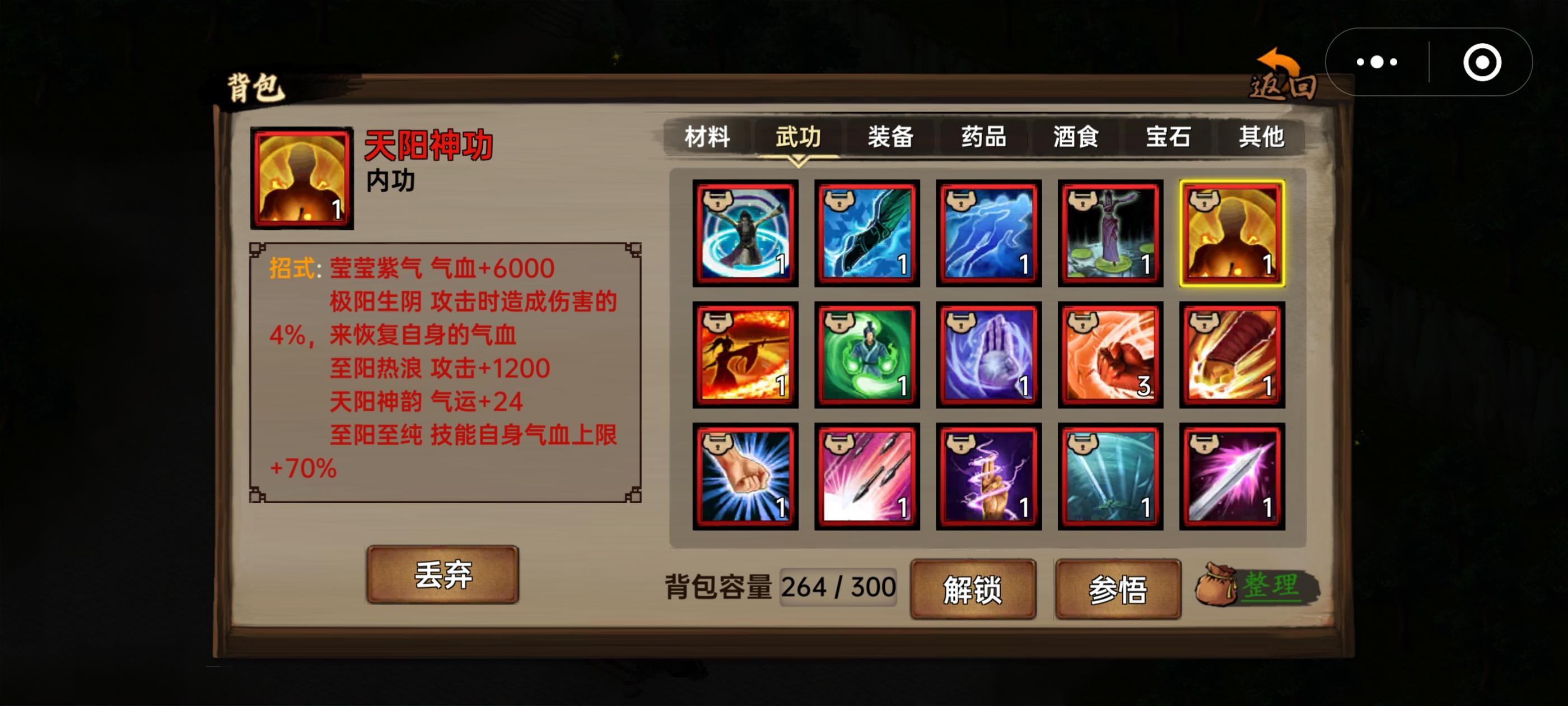 喝酒单出的无敌剑法,之后一直在参悟重剑,最近才凑齐三个,合成以后的效果刚开始以为一般,没想到算是平民毕业剑了(毕竟只充过一个小月卡),哈哈哈哈,运气真不错