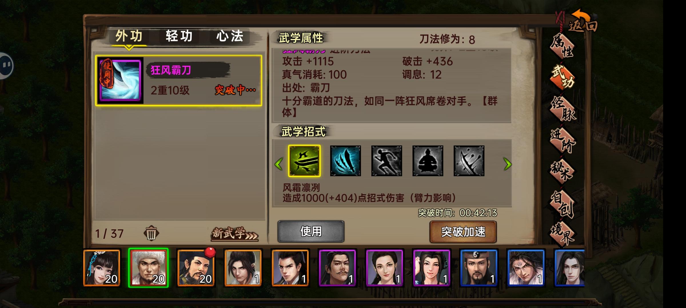 什么开局要选千面公子,出手慢得要死,还不自带紫色轻功内功坦度不够,要白凌霜抗伤害,目前可以打到无量20层,闲出手慢的建议改抽曲言风,毕竟这是个漫长的养成游戏,除了刀魔、剑无敌,后面都会有的。