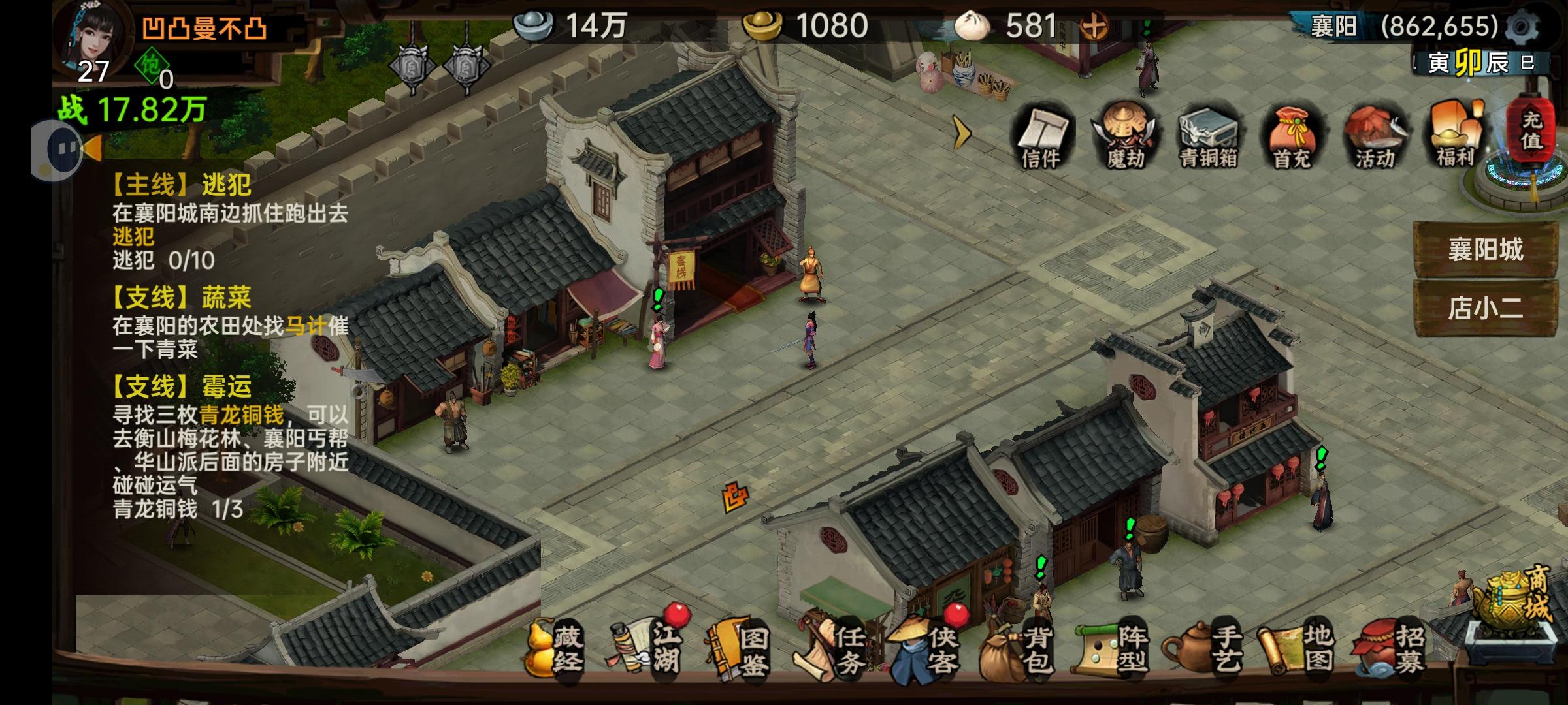 要求:上阵侠客红群攻一个(必须红武),红单攻一个(随意)培养方案:主角只点轻功(一直都是废物),历练点专注培养红群攻,红单攻如果是红武就能养注意:攒下来的历练点不要给金,紫武侠,宁可空着上阵位置都不要给规划:临安主线结束前不养主角1、桂花村:过主线,支线全清,历练点全部留着桂花村结束给十连(刷不到红群攻加红武就重开)2、临安:主线会卡两次,注意操作。优先主线,会卡十二时辰的夜晚戌时