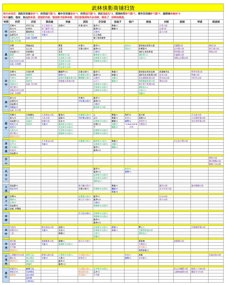 每天必须买:洛阳杂货铺金针*1,药堂凝穴散*3,蜀中杂货铺金针*1,药堂凝穴散*3,铁匠强化石*3,南海药堂补气散*1,塞外杂货铺补气散*1,裁缝铺冰蚕丝*3每天襄阳,临安,衡山的米酒,酒加状态的,级别够才能喝高级,所以低级酒每天必须喝,级高了,好喝高级酒。