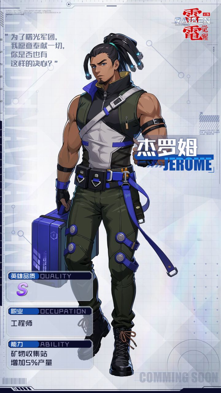 工程师丨杰罗姆(Jerome)——“喔!你也喜欢我的贴身作战服吗?这可是我身份的象征。”年纪不大却喜欢自称自己为“老夫”。将忠义作为自己人生信念的人,是个为了忠义不惜牺牲自己性命的人。