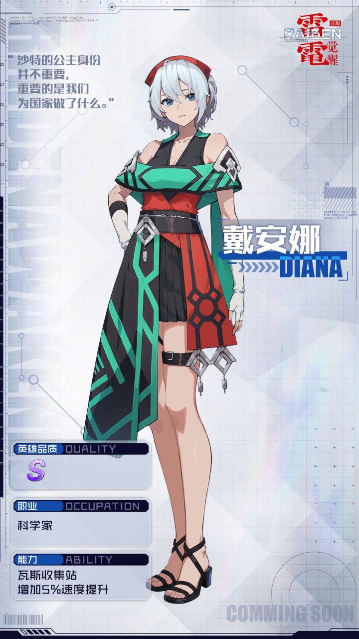 科学家丨戴安娜(Diana)——“沙特的公主身份并不重要,重要的是我们为国家做了什么。”虫族入侵时,沙特阿拉伯是虫族入侵战略点之一,沙特国民死伤无数。身为沙特公主的戴安娜看到国民遭受苦难,自己却无能为力十分痛心,对自己的无能感到悲伤,沙特被虫族占领后,戴安娜带领剩余的沙特国名和军人顽强的和虫族战斗,伺机夺回沙特。