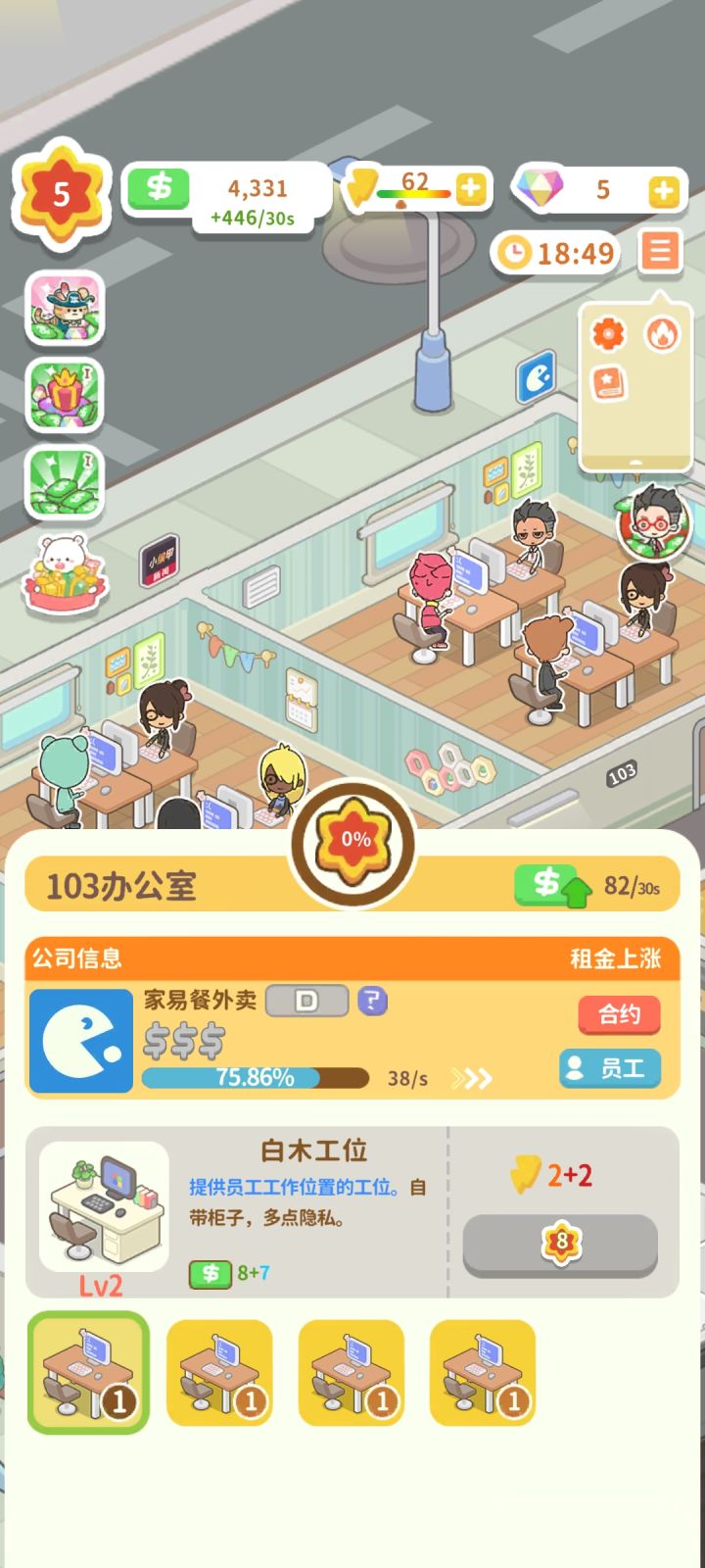 4. 放置游戏,睡一觉起来你以为自己可以美美收菜大跃进了吗?一个晚上的收益收下来只够你升级两三个家具。更别说还有一个【最大的天坑】,引进的公司租的时间越长,等级越高,租金越高,然而八个小时之后,他们就会跑了,你作为房东还要花巨额资金求他们留下来。收菜?不可能的,你收的菜只够挽回这些大爷中的一两个!!一晚上回来你不仅没有暴富!!!你还负债前行!!!!!真tm恶心得我把两星改一星