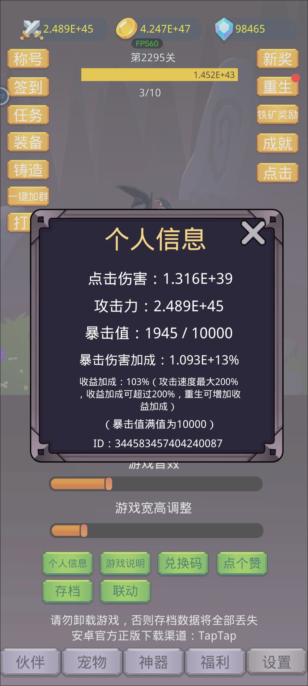 本片帖子,主要是为新人入门不迷茫而准备。 准备入坑的,可提前来看下帖子。 一、界面篇 这是游戏进入后的主画面,下面来依次进行讲解。 1、攻击、金币、钻石 最上面一排,依次是主角的攻击力、金币数量、钻石数量。 攻击力:是主角的攻击力,自动进行攻击,攻击频率为1秒。 金币:主角持有的金币数量,仅用于升级伙伴(后面会讲解),重生后会重置。 钻石:游戏核心资产,升级宠物,就靠这个了,重生不会重置,主要获取