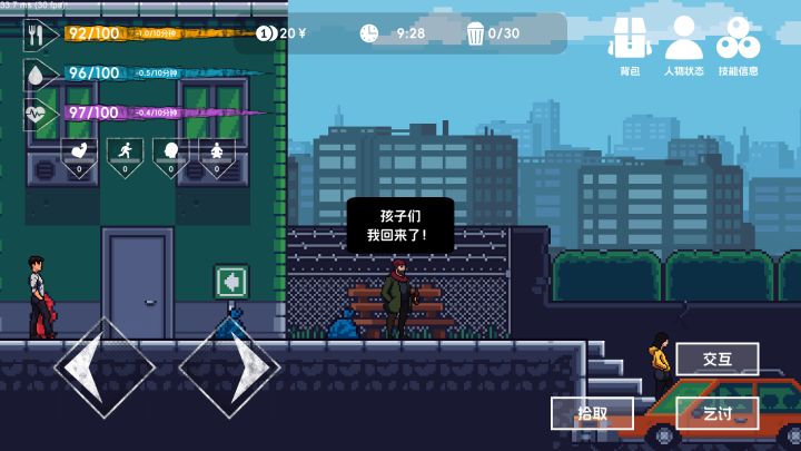 在获取街道过夜方面的技能前,我建议前期在收留所过夜,因为收留所不仅不会产生消耗,还可以恢复大量属性,这样前期饱食度的压力非常小。关于饱食度,我建议多去小摊那里购买消耗品,去餐厅吃饭,或者点一些垃圾桶方面的技能,可以通过垃圾恢复大量饱食度和精神,乞讨也有概率获得消耗品。关于卫生,可以去厕所恢复卫生,但是需要花一定时间,时间可以通过商店中的“牙刷”道具来进行缩短。关于精神,这个属性比较重要,因为