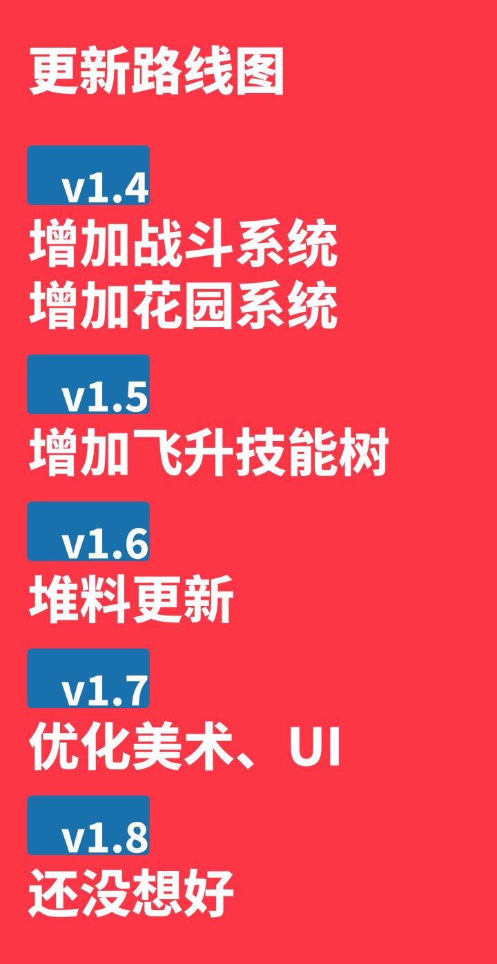 2023年7月2日 19点58分。最终更新1.3已经提交,正在审核。最终更新。由于本人技术太差,游戏底层架构十分糟糕,在此之上维护游戏举步维艰,如果强行为游戏续命,我无法提供稳定、可靠的游戏体验(其实最近版本已经体现出来,主要是白屏,还有丢存档的问题)。在此感谢所有玩过本游戏的玩家,感谢所有人的支持。