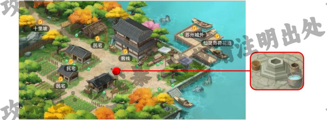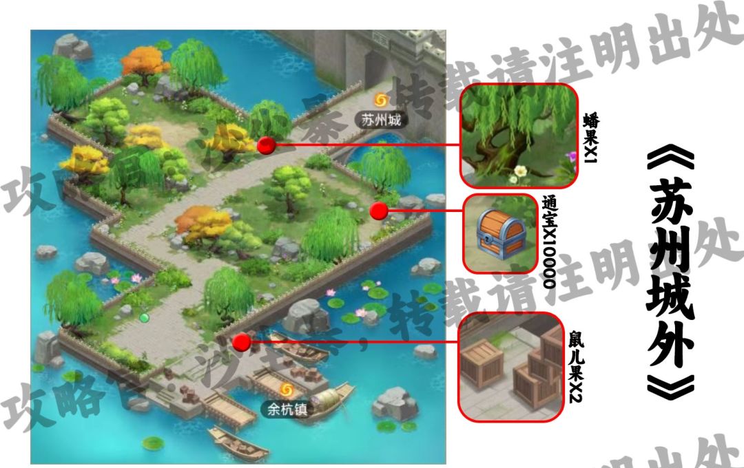 新的开始在游戏场景里也会有一系列的隐藏小彩蛋,这里将彩蛋都标注在地图上了,方便各位寻找 方法:点击图片中展示的位置即可获取物品,如果一次没出可以在附近多点几次,大致位置是不变的 1.苏州城外 2.苏州城 大宝箱为拼图宝箱,就不展示方法了,应该都能拼对 3.林家堡 4.林家客房