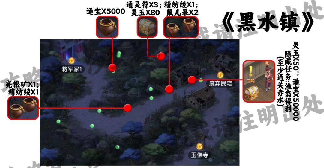黑水镇是战斗地图,隐藏的物品不多,但战斗地图的宝箱和罐子排布会有些乱,所以这里也将黑水镇的地图都展示出来,方便玩家们检查自己是否有漏掉的箱子罐子 1.黑水镇(乱葬岗) 2.将军冢一层 3.将军冢二层 3.将军冢三层+一笔画宝箱 4.赤水一层 5.赤水二层