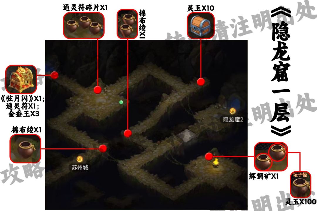 隐龙窟是战斗地图,隐藏的物品不多,但战斗地图的宝箱和罐子排布会有些乱,所以这里也将隐龙窟的地图都展示出来,方便玩家们检查自己是否有漏掉的箱子罐子 1.隐龙窟一层 2.隐龙窟二层 3.隐龙窟三层 4.隐龙窟四层+一笔画宝箱攻略
