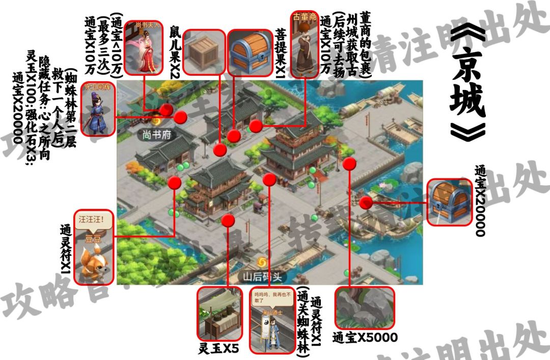 新的开始在游戏场景里也会有一系列的隐藏小彩蛋,这里将彩蛋都标注在地图上了,方便各位寻找 方法:点击图片中展示的位置即可获取物品,如果一次没出可以在附近多点几次,大致位置是不变的 1.京城 2.尚书府 3.后花园+刘晋元房 4.蜘蛛林一层 5.蜘蛛林二层 6.蜘蛛林三层