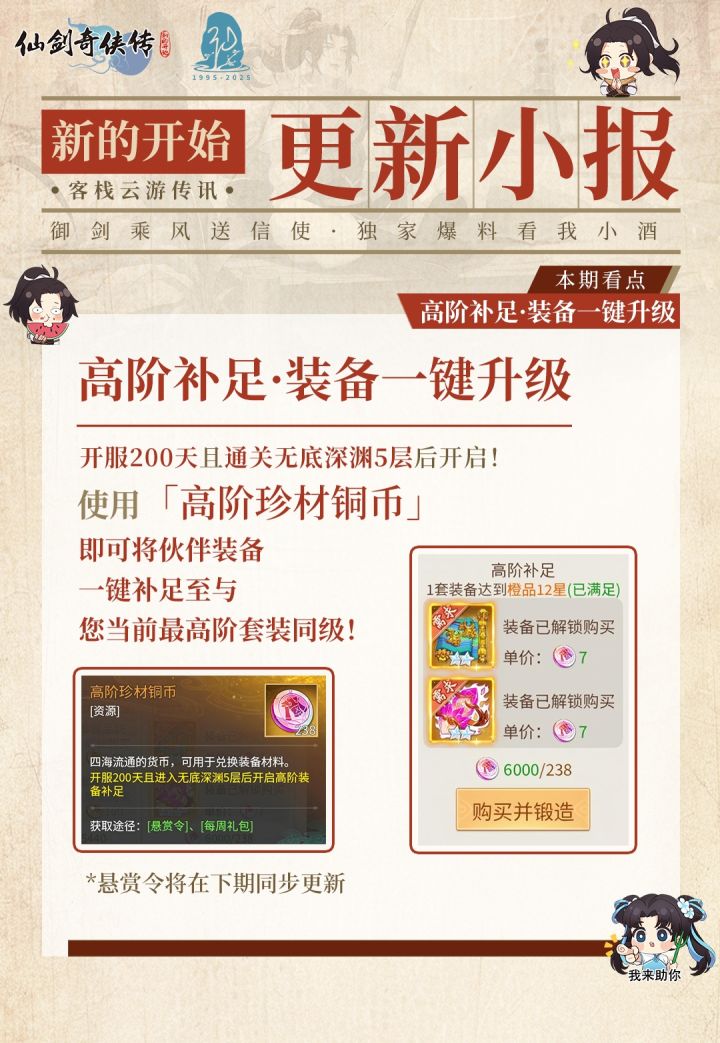 高阶补足:开服200天且达深渊5层开启,快速补足伙伴装备至当前最高阶!蜀山问剑:新增350-399层,挑战再攀高峰!巅峰龙虎:新增瑕、重楼·魔临九天、王蓬絮·四月芳菲、柳梦璃·幻瞑之主四位伙伴!礼包码:雕花礼包截止:25年11月8日礼包领取方式:游戏-头像-礼包兑换不要走错咯~