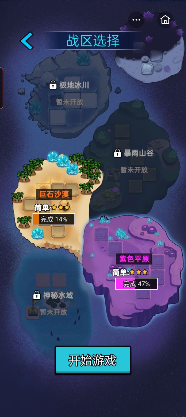 内容上就是开局即玩,玩法上开局自己可以选择一处地方落脚,然后挖掘周边的矿,可以升级增加矿工和升级基地,以及增加采集机器(矿机)、侦查机器(侦查机、闪光弹)、发射器(近防炮、榴弹炮、导弹)以及领土扩张小旗子。