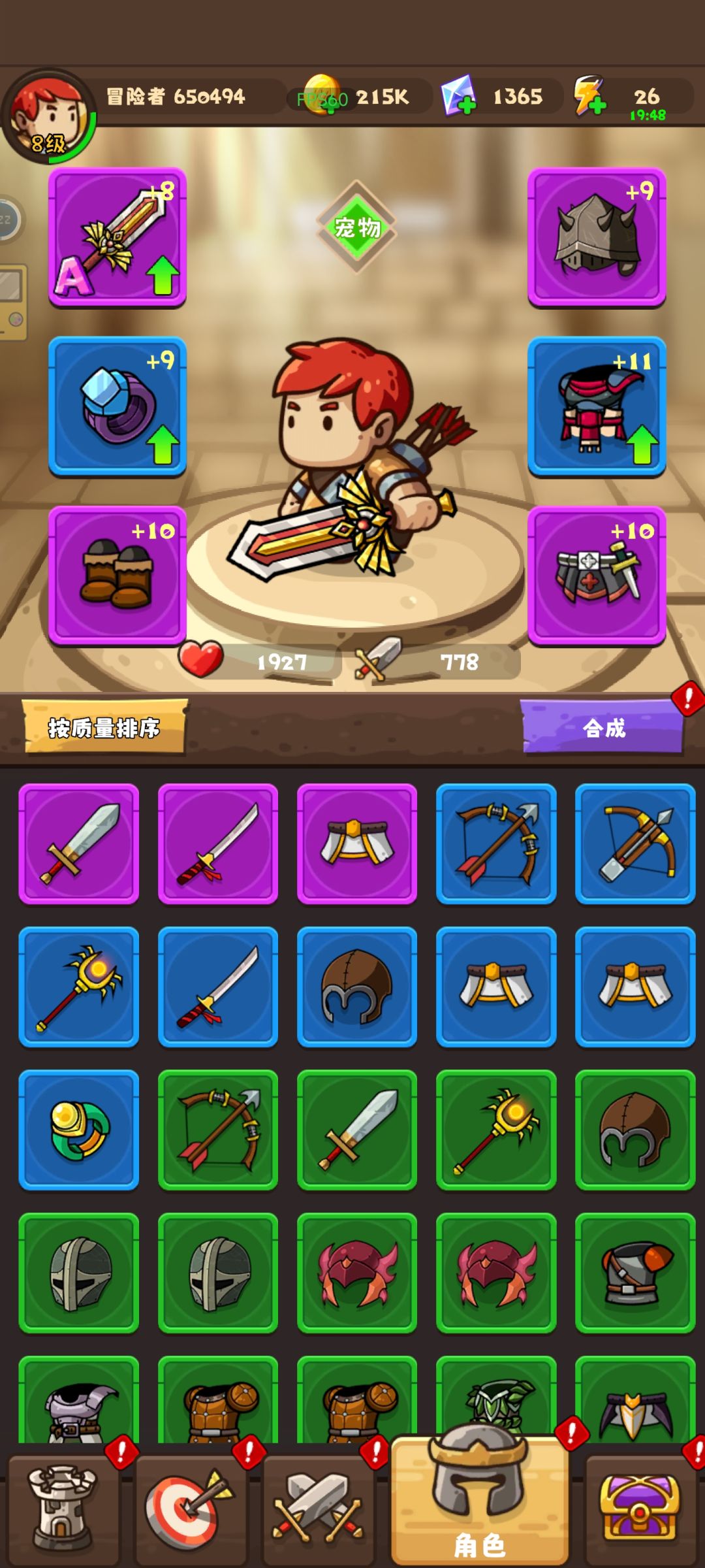 新人小白已经玩了一个星期了,看看群里大佬们的神装是羡慕的直流口水。经过探索,发现装备有几个获得途径,一个就是开三种扭蛋,普通是10次获得优秀装备,黄金的是10次获得紫色装备,豪华是50次获得s级装备。第二个就是扫荡关卡后可以随机获得装备,现在通过20,可以获得优秀装备。还有一种就是闯关失败后有礼包,里面有1件紫色武器。