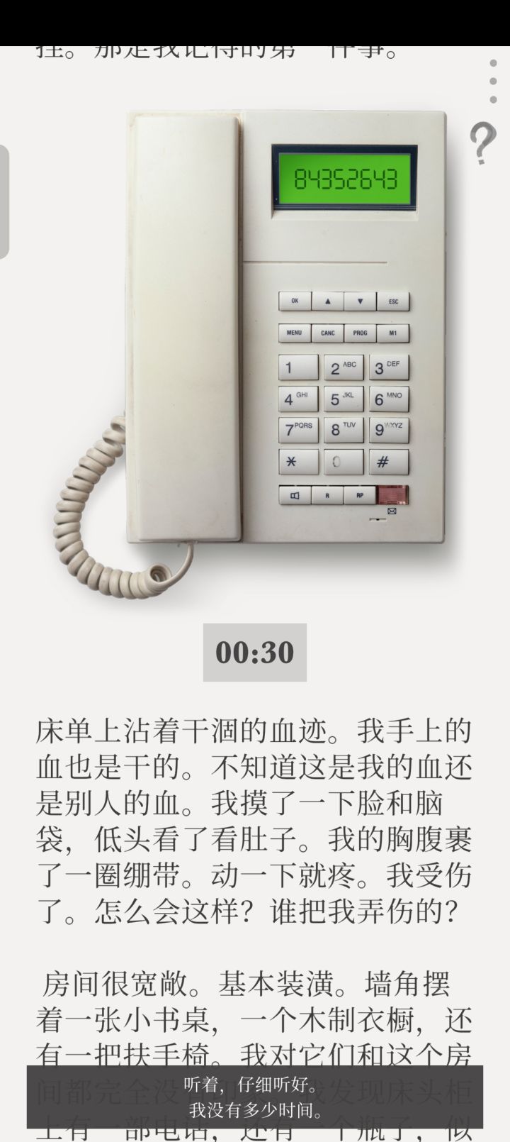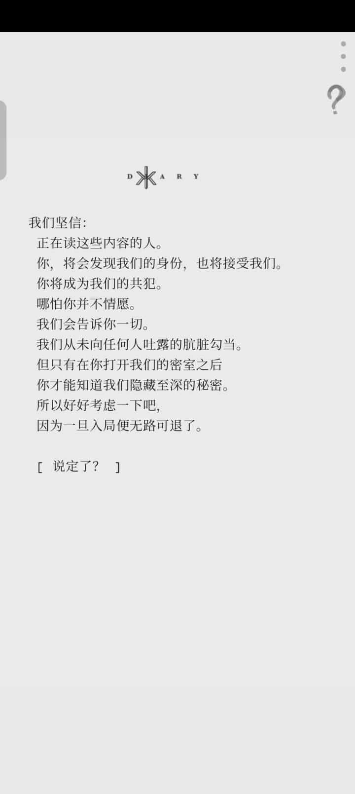 很新颖的一种解密方式,文字里夹杂信息,图片翻转带信息,或者回顾文字有新的信息,或者长按文字等等方法,进行多方面交互,还有音乐,录音,做的都挺不错的。