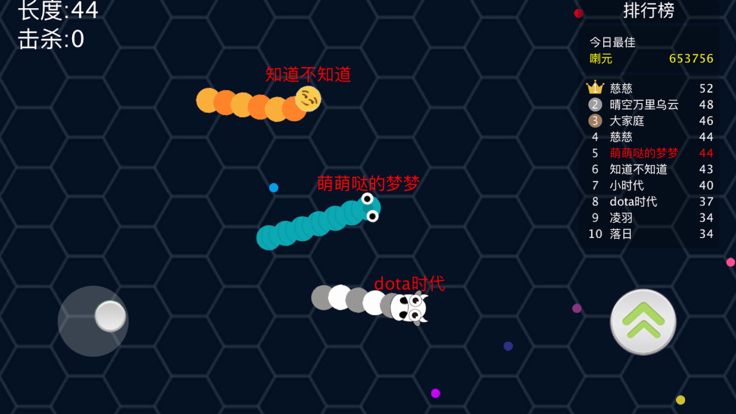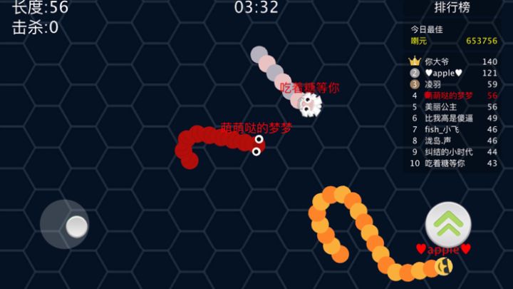 2、灵活走位,小蛇也能逆袭!避开敌蛇的同时也要讲究策略的哦,怎样让他撞到你的身上从而干掉他是很考验智商的哦!