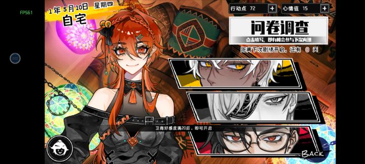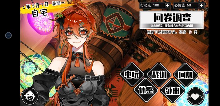 测试内容有点少,不过挺满意的,女主感觉是个直率有责任爽朗的女汉子。卫商的温柔偏爱比较戳。另外一个是对立面,一个是正经责任心的正直。顽皮闺蜜也挺可爱的,也期待配角们的故事,去废都怎么触发卫商剧情想问一下,不知道怎么加好感。q版也蛮可爱的。之后行动力和心情会随着时间恢复吗,也期待开放互动和场景剧情,加油。