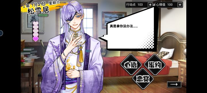 加好感可以去【回想】(剧情回顾),选【同伴】那段剧情,反复刷为了卫商。(第三个按键可以快进,第一个和最后一个存档,第二个读档,记录一下话语)喜欢珍藏手绳和真拿你没办法这种无奈温柔宠溺!