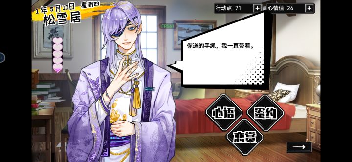 加好感可以去【回想】(剧情回顾),选【同伴】那段剧情,反复刷为了卫商。(第三个按键可以快进,第一个和最后一个存档,第二个读档,记录一下话语)喜欢珍藏手绳和真拿你没办法这种无奈温柔宠溺!