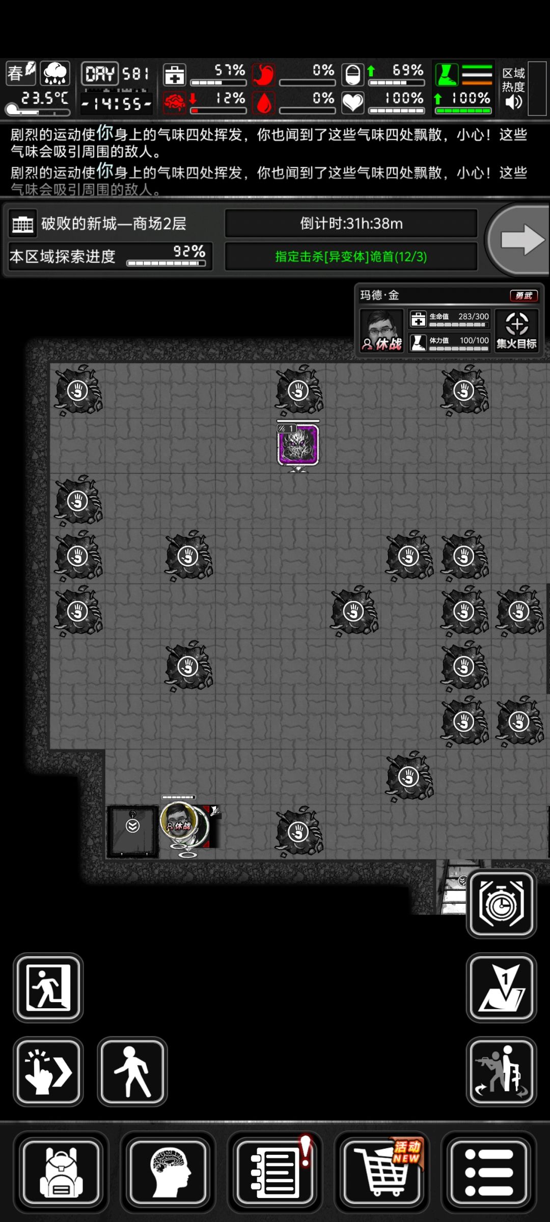 ■首先有请最让人头疼的深夜大块头登场。 ■这距离多看一眼就要爆炸。 ○不要尝试平a,胃炎平a频率对新手来说是地狱级别的。 ■我们往上走两个格子,然后结束回合。 ○注意,如果你奔跑姿态走,能多争取一枪到两枪的时间,对自己暴击率不自信的话,还是用跑的。 ○当然你也可以趁这个时间把装备、弹药补一补,但这会让你少打一枪。 ■好了,胃炎跟上来了。 ■现在是完美的输出时间,因为它想攻击到玩家还得再走一格。 ■