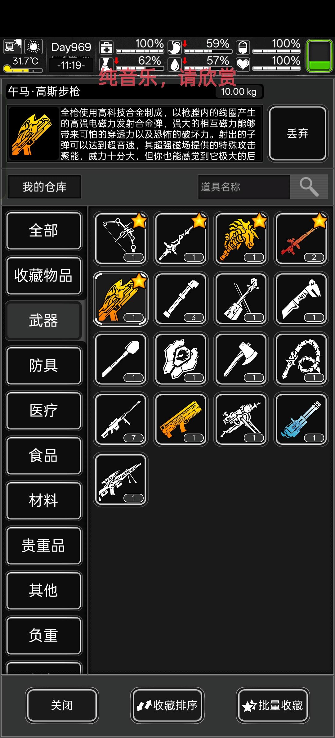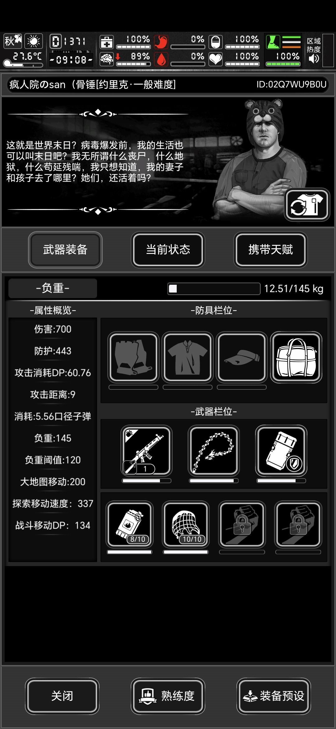 算了一下距离我满战需要蹦到1000天,开个帖子记录一下蹦迪效率 武器:碳纤维武士刀*10(右手放把极开作为防身武器) 天赋:战斗天赋均5(发帖的时候已经挂机挂到均6了) 防具:0.88左右的防毒,370以上的防御(陶瓷套),晕抗0.55以上(没有活动防具肯定是做不到的) 地点:防控中心2楼(二楼只要不堵门就不会刷岩胄) buff:4阶sg(2阶需要时不时补下血,3阶就可以一直挂机,4阶伤害更高回血