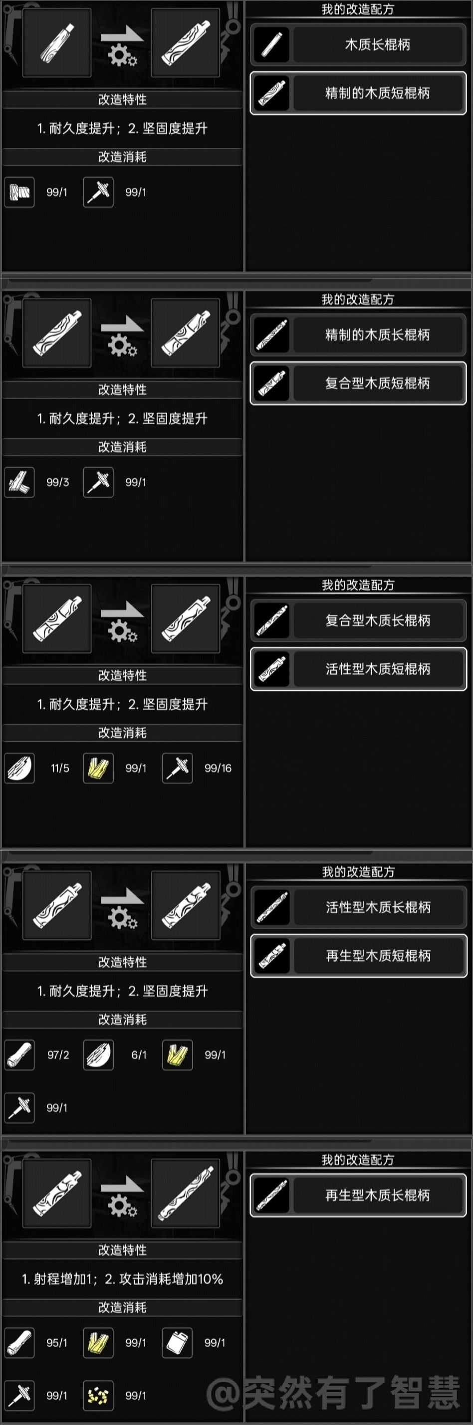 【战旗】 ★本文【针对无熟练度或低战的前中期】测评,主要思路是【流血和毒伤】教萌新高性价比打7阶。【高战或高熟练及资源无限】的大佬请忽略。(数据也用的本人低战2熟练的数据) ★首先蛇年活动武器换了之后最好换个好握把再用。萌新直接每次砍不了几刀握把就坏了,本文均配置的再生木握把,据大佬说耐用(我活性木多) 面板如图,武器除了握把都是活动获得。 ★★伤害期望值(7阶防御148-197,算上格挡修正就按