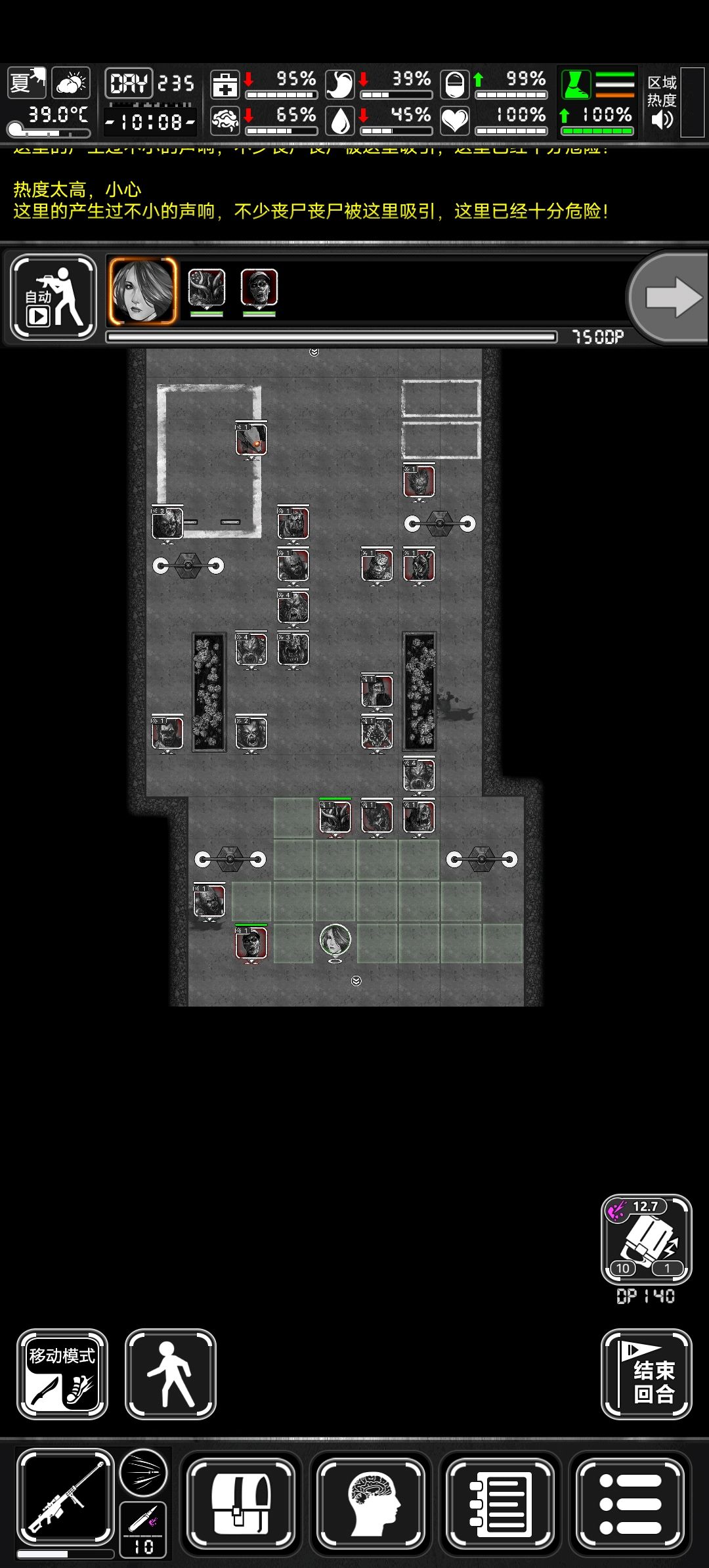 首先我不是大佬,天赋5级以下,这是最近玩战棋的心得。 利用战棋模式能打远处怪的特性以及电台做到跑商无忧(除了箱子需要去打8阶),每天还能赚1千生存点 所需如下 1,巴雷特狙击枪,子弹若干(特殊子弹更好),最好有补偿器(自己做,加暴击)和4倍镜(肯特黑胖加尔好像都卖,加暴击),狙击枪弹匣(必备) 2,一把近战刀(推荐马刀,三格距离),能一刀砍死4阶(除了肉)就行 方法:进入7阶一般尸潮,如果有天