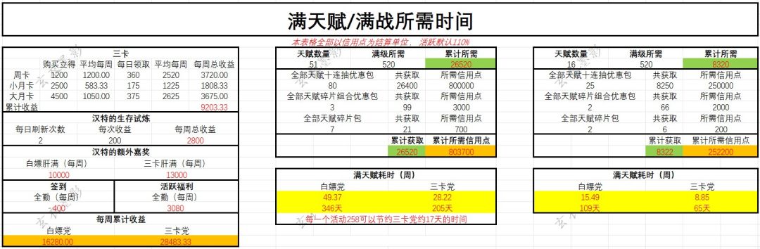 天赋,活下去最大的氪金点之一,也是比较肝的内容之一。 经常能看到有人问满天赋/满战要多久,就大致的做了一个表格供大家参考。 P.S. 个人整理,如有出入,请留言或私聊; 由于每个人购买意愿不同,黑券商城暂时不计入 (图片在13楼自取) 2024.10.11 修改了周卡每周平均的数据错误